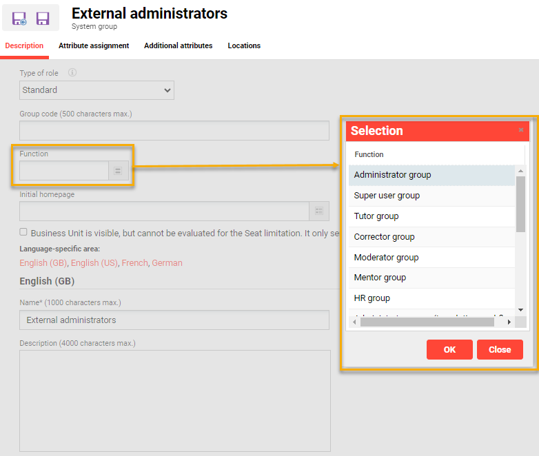 Jeder Mandant wird mit völlig eigenen Systemgruppen zur Definition von Rollen konfiguriert, z. B. Lernende, Betreuer, Lehrer, Kursadministrator und Systemadministrator. Dies geschieht in der Funktion „Organisationsstruktur und Gruppen“ durch die Erstellung neuer „Systemgruppen“, in denen der Name und die Funktionen jeder Gruppe definiert werden. Es empfiehlt sich, die Gruppen zu einem frühen Zeitpunkt der Konfiguration anzulegen, da dann die Standardfreigaben für Objekte und Geschäftsregeln für die Zuweisung von Benutzern oder die Erteilung von Freigaben für Benutzer festgelegt werden können.