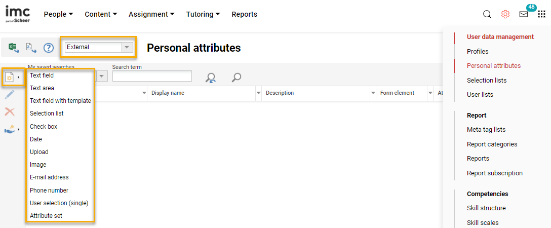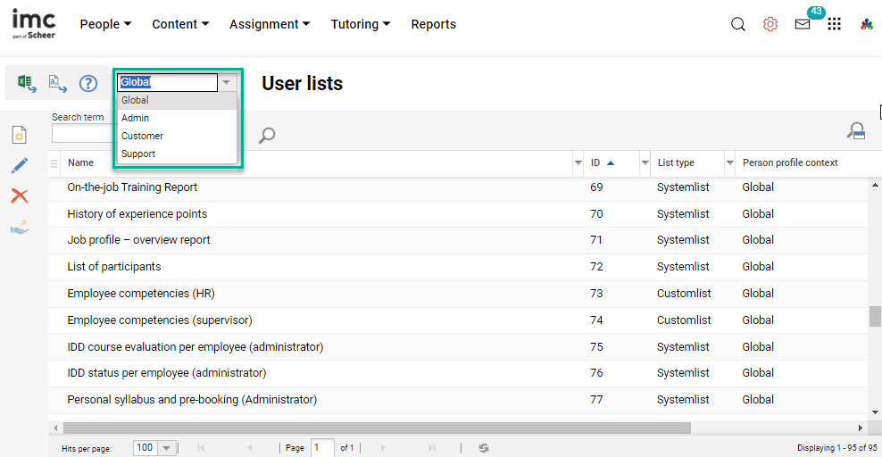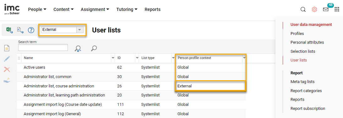 Nutzerlisten werden verwendet, um die persönlichen Attribute zu steuern, die als Spalten oder Filter in vielen Funktionen und allen Bildschirmberichten, die Nutzerdatensätze enthalten, verfügbar sind. Die mandantenspezifische Konfiguration stellt sicher, dass nur die gewünschten persönlichen Attribute verfügbar sind, um die Nutzerfreundlichkeit zu verbessern; zum Beispiel kann die Konfiguration der „Nutzerverwaltung“ und des „Personalpools“ wichtig sein. Um mandantenspezifisch zu konfigurieren, ändern Sie einfach den Mandantenkontext von „Global“ auf den gewünschten Mandanten.
