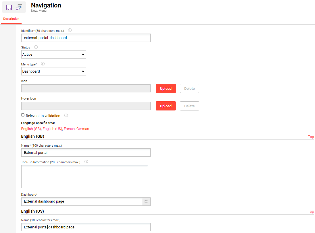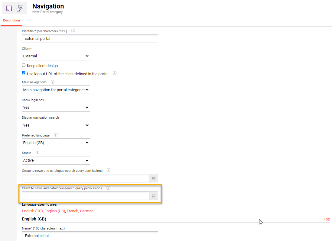 Externe Startseite: Ermöglicht die Auswahl eines Menüpunkts der Portalnavigation als externe Startseite. Wenn eine Client-Navigation eingestellt ist, wird die Client-Navigation als externe Startseite verwendet. Wenn keine Navigation festgelegt ist, wird der am weitesten links stehende Navigationseintrag als externe Startseite verwendet. Wenn kein Navigationseintrag definiert ist, wird die System-URL als externe Startseite verwendet.