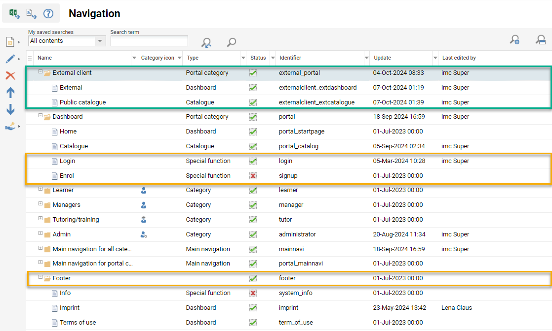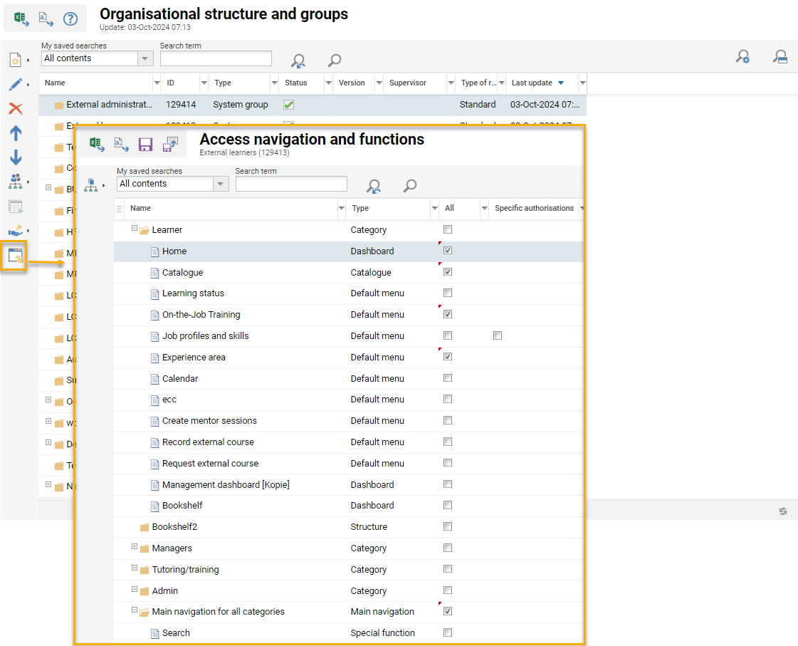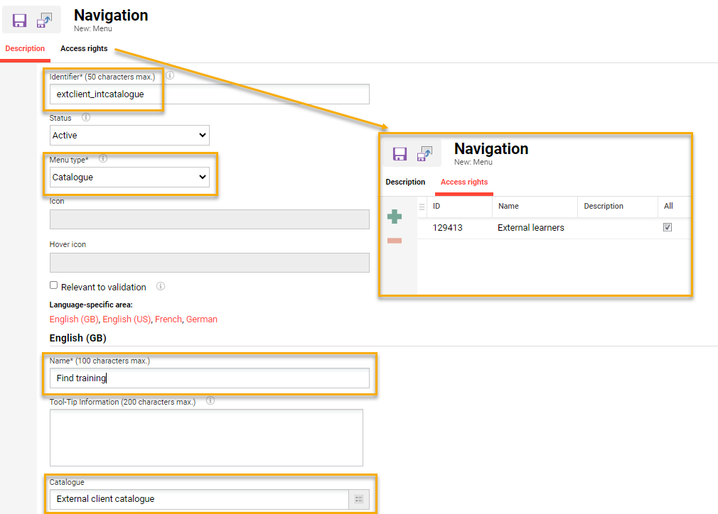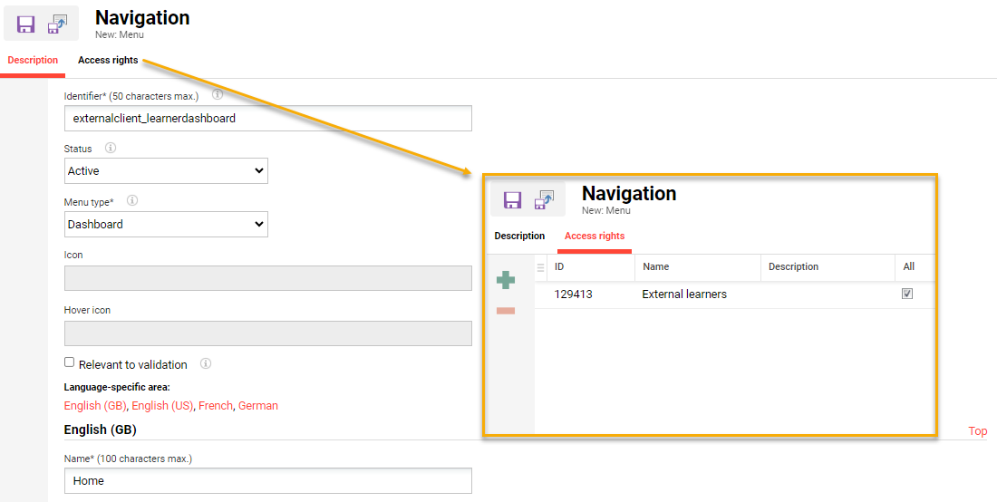 Bei der Erstellung neuer Rollengruppen ist es wichtig, die „Zugriffsnavigation und -funktionen“ so zu konfigurieren, dass der Zugriff auf die erforderlichen Menüs möglich ist. Für die Gruppen Lernenden und Betreuer wird dies weiter geändert, sobald neue Navigationsmenüs für interne Dashboard-Seiten und Kataloge konfiguriert sind (später beschrieben).
