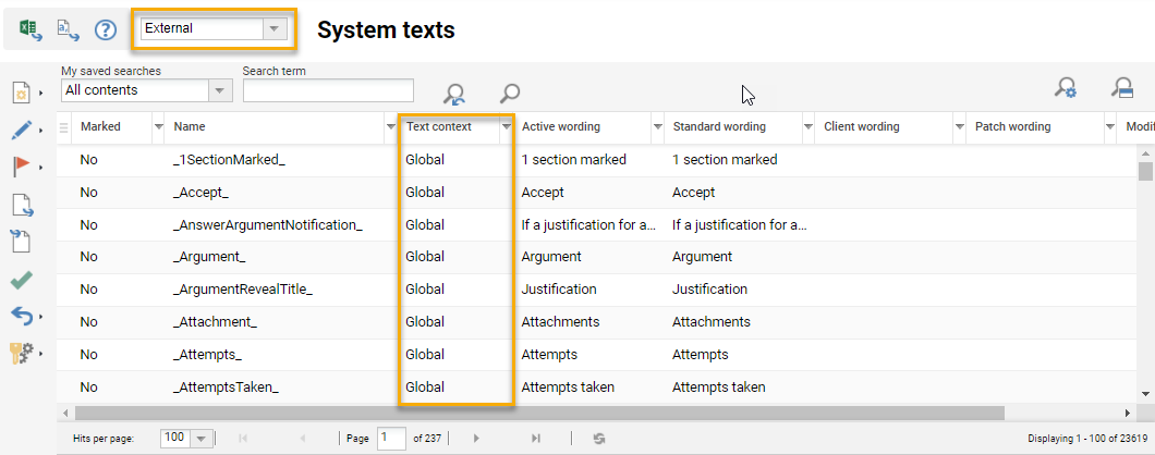 Der Systemtext ist ein weiterer Bereich, der kundenspezifisch konfiguriert werden kann. Der Wortlaut ist über die Funktion „Systemtext“ konfigurierbar, wo über 23.000 Systemtextbündel bearbeitet werden können. Änderungen können pro Mandant vorgenommen werden, indem das Auswahlfeld für den Mandantenkontext von „Global“ auf den gewünschten Mandanten geändert wird.
