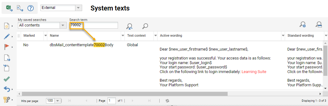 Bei über 23.000 Systemtextbündeln kann die Konfiguration des Wortlauts eine zeitaufwändige Aufgabe sein, so dass bei einer typischen mandantenübergreifenden Konfiguration zunächst begrenzte Systemtexte wie projectTitle (Name der Browser-Registerkarte) und E-Mails zur Kontoregistrierung (z. B. 70002, 70003) aktualisiert werden, wobei die Namen der Systeme zwischen den Mandanten variieren können.