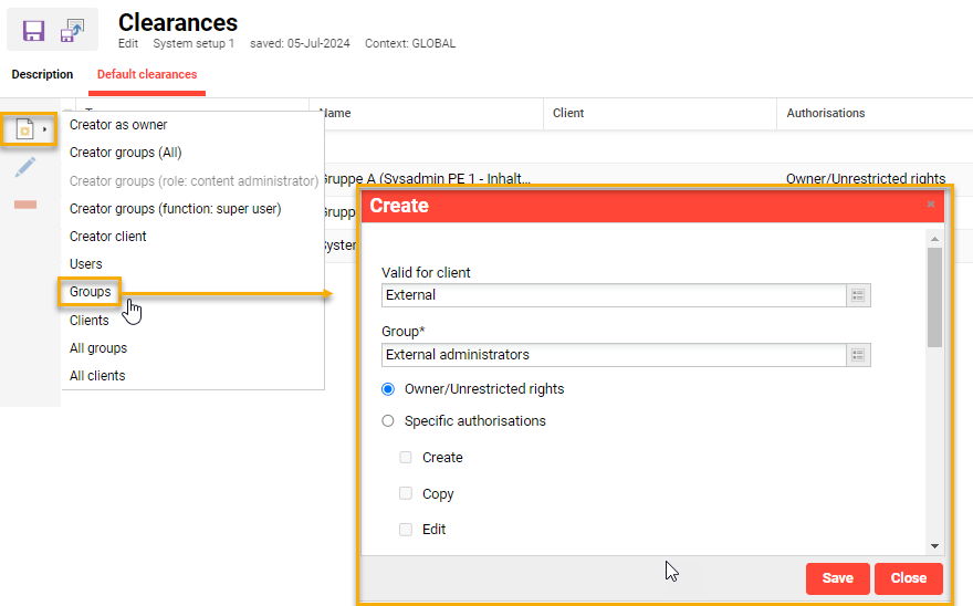 Standardfreigaben für Objekte, die von Benutzern innerhalb jedes Mandanten erstellt werden, können in der Funktion „Konfiguration > Freigaben“ konfiguriert werden. Diese Freigaberegeln werden normalerweise vom imc Business Consulting Team oder dem Systemverantwortlichen konfiguriert, nachdem die mandantenspezifischen Gruppen erstellt worden sind.