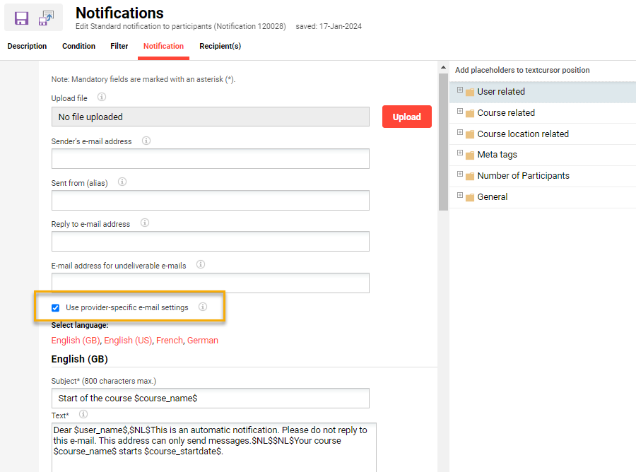 Wenn Sie auf der Registerkarte „Benachrichtigung“ das Kontrollkästchen „Anbieterspezifische E-Mail-Einstellungen verwenden“ aktivieren, wird die Benachrichtigung automatisch von der E-Mail-Absenderadresse und dem Alias des mit dem Kursanbieter verknüpften Kunden versendet; wenn der Anbieter nicht verknüpft ist, können die Absenderdaten manuell eingegeben werden oder es werden die globalen Standardabsenderdaten verwendet.