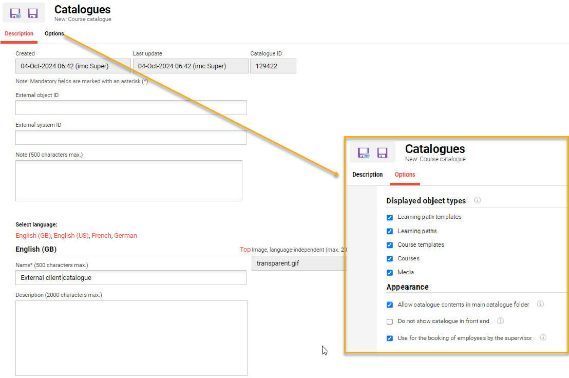 In dieser Registerkarte sind verschiedene Konfigurationsmöglichkeiten zusammengefasst, die alle Auswirkungen auf den Client haben. Detaillierte Informationen zu den einzelnen Funktionen und Einstellungen können Sie der Online-Hilfe entnehmen, die pro Feld mit einem „i“ gekennzeichnet ist. Nachfolgend finden Sie Einstellungsbeschreibungen für Felder ohne das „i“-Symbol:Öffentliche Lernplattform URL*: Die hier eingegebene URL wird für Links im Lerner-Frontend verwendet (z.B. Links direkt aus dem Katalogmanager). Bitte beachten Sie, dass die URL mit „/ilp“ enden muss.