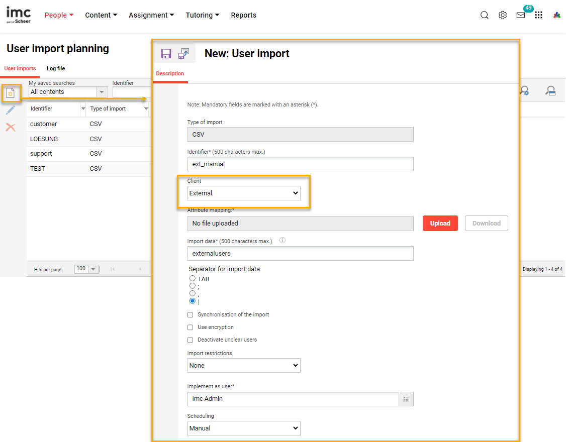 Wenn Importaufträge so geplant sind, dass sie automatisch täglich, wöchentlich oder monatlich ausgeführt werden, muss ein imc-Berater den Zugang zu einem von imc bereitgestellten SFTP-Server organisieren. Der Kunde ist dann dafür verantwortlich, den vereinbarten .csv-Dateinamen zur vereinbarten Zeit zu laden, und ein Übertragungsauftrag kopiert die Datei vom SFTP-Server an einen bestimmten Ort auf dem LMS-Inhaltsserver (z.B. \data\person\personimport\src\external). Das imc Hosting-Team stellt den Kunden eindeutige Anmeldedaten für den Zugriff auf ihr SFTP-Konto zur Verfügung, und der Zugriff kann bei Bedarf durch IP-Whitelisting eingeschränkt werden.