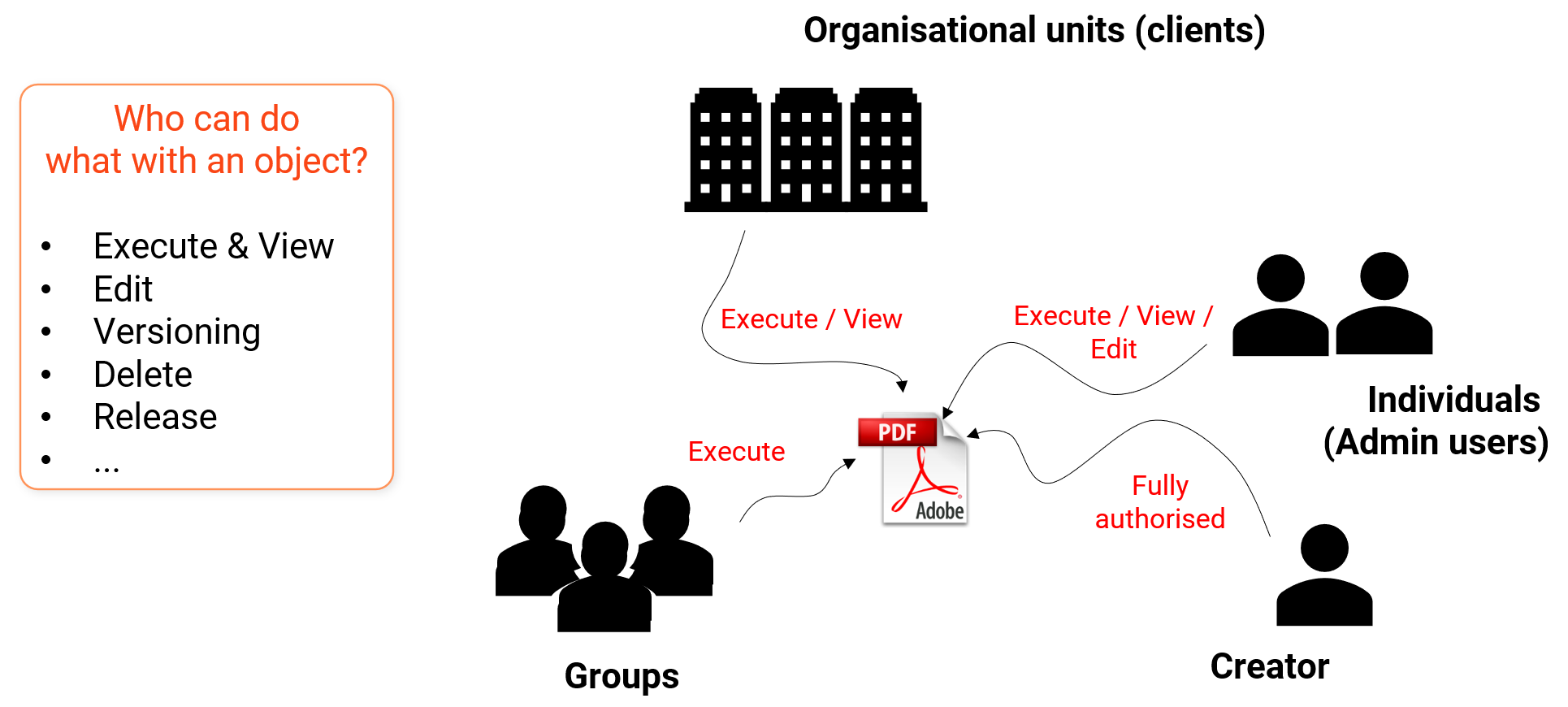 Freigaben können automatisch durch konfigurierte Geschäftsregeln oder manuell durch Administratoren bei der Erstellung von Objekten erteilt werden. In den Verwaltungsfunktionen ist es möglich, die Zugriffsberechtigungen für Objekte über das Symbol „Freigabe“ anzuzeigen oder zuzuweisen. Bei der Erstellung eines Objekts erhält der Ersteller die volle, uneingeschränkte Freigabe. Bei der manuellen Zuweisung von Freigaben an andere Nutzer kann der Ersteller nur einzelne Nutzer und Gruppen auswählen, für die er eine Freigabe zur Ansicht im LMS hat.