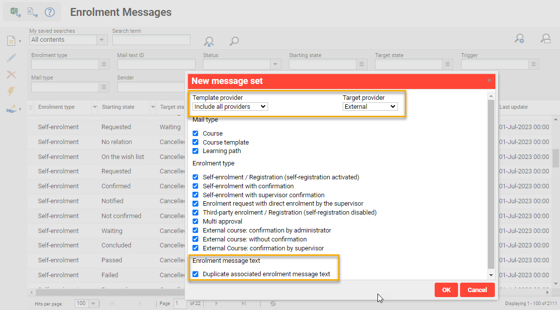 Wenn für Kurse und Lernpfade ein Branding oder ein anderer Wortlaut für die Einschreibungsnachrichten erforderlich ist, können die Texte der Einschreibungsnachrichten erstellt oder dupliziert werden, wobei HTML für jeden Kunden aktualisiert wird. Dann kann der gesamte Satz von Einschreibungsmeldungen für einen bestimmten Anbieter dupliziert werden. Dies geschieht am effizientesten innerhalb der Funktion „Einschreibungsnachrichten“, wo ein ganzer Satz von Einschreibungsnachrichtentexten und -auslösern für einen Anbieter mit Hilfe der Funktion „Neuen Nachrichtensatz automatisch erstellen“ dupliziert werden kann.