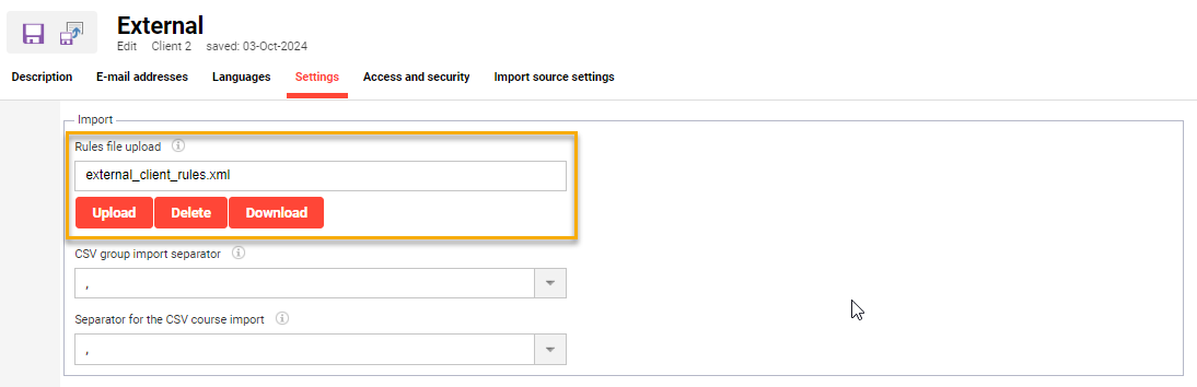 Regeln Datei-Upload: Ermöglicht das Hochladen einer kundenspezifischen Nutzerimportregeldatei, die anstelle der systemweiten Nutzerimportregeldatei verwendet wird.