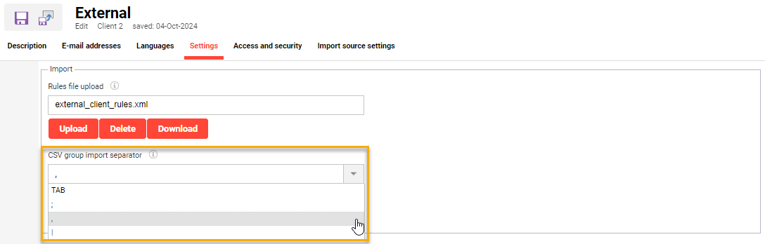 Der Import von Geschäftsbereichs-Gruppenstrukturen ist üblich für Mehrmandantensysteme, die Organisationen oder externe Nutzer trennen, die zu physischen Standorten gehören, die Aufsichtspersonen erfordern (z. B. Clubs und Regionen). Es werden zwei Importmethoden unterstützt: eine einfache .csv-Datei zum Erstellen/Aktualisieren von Strukturen und eine erweiterte .xml-Datei, die auch die Nutzerzuweisung unterstützt. Für den .csv-Import gibt es in der Funktion „Kunden“ auf der Registerkarte „Einstellungen“ eine Einstellung namens „CSV-Gruppenimporttrennzeichen“.