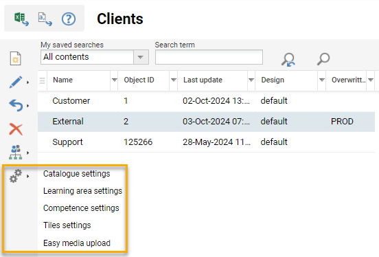 Sobald der Kunde gespeichert ist, gibt es einige zusätzliche funktionsspezifische Einstellungen in der Funktion „Kunden“, die für jeden Kunden konfiguriert werden können. Dies sind die Einstellungen für den Katalog, den Lernbereich, die Kompetenzen, die Kacheln und den einfachen Medien-Upload. Von diesen Einstellungen muss nur die letzte konfiguriert werden, wenn die Funktion „Einfache Kurserstellung“ oder „Kanäle“ verwendet werden soll.