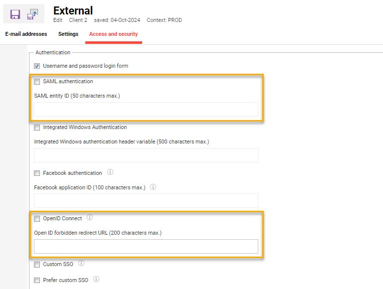 Weitere SAML2- und OIDC-Konfigurationsfelder finden Sie in der Funktion „Mandanten“ auf der Registerkarte „Zugang und Sicherheit“. Das Kontrollkästchen muss angekreuzt werden, um die entsprechende Schnittstelle auf dem Portal für den Kunden zu aktivieren, und für SAML2 muss die Entitäts-ID eingegeben werden.