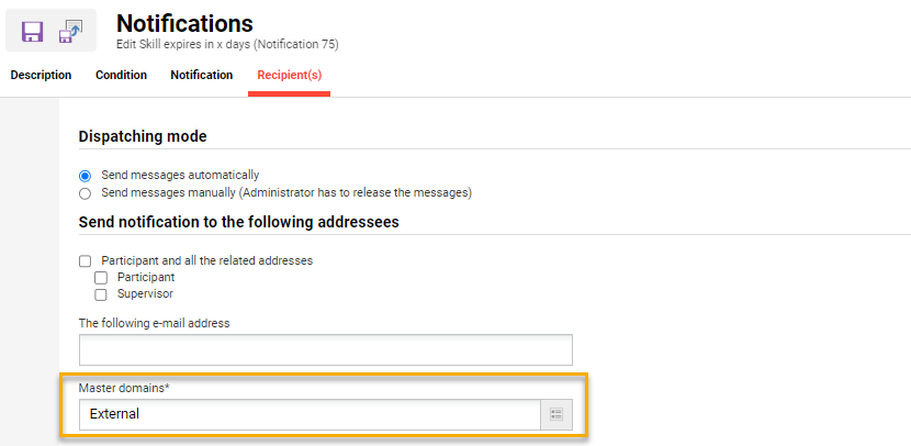 Für Benachrichtigungen, die nicht mit Kursen in Zusammenhang stehen, können diese auf Benutzer nach ihrem Master-Mandanten im Feld „Empfänger“ eingeschränkt werden, indem der Mandant im Feld „Master-Domänen*“ ausgewählt wird.