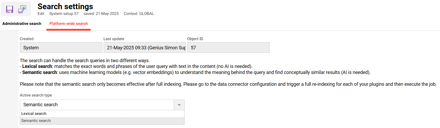 Go to “Configuration” > “Search settings”, 2. tab “Platform-wide search” and switch the “Active search type” to “semantic search”.