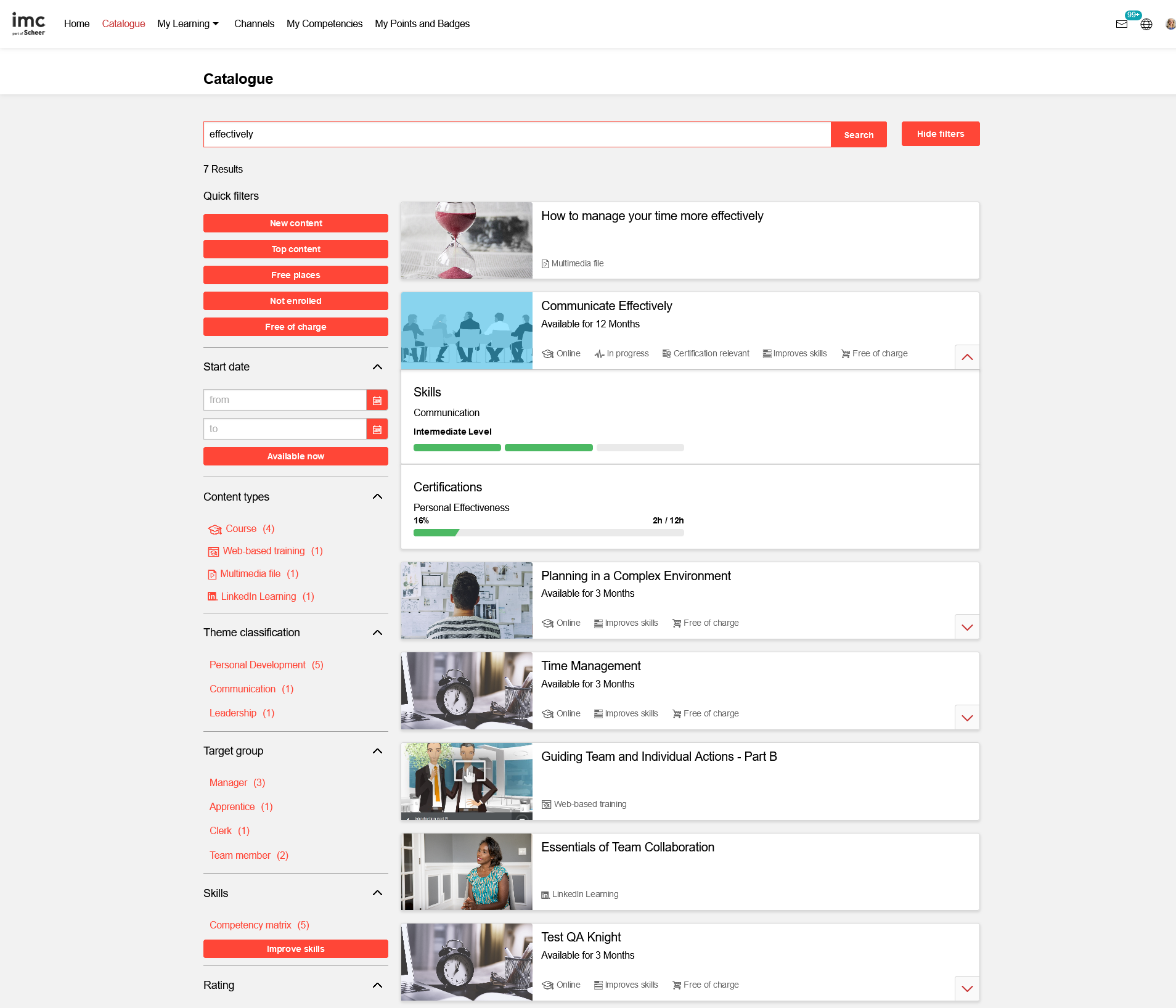 The "Catalogue" menu is where learners search for available training content (Media), Courses and Learning Paths to either directly enrol, request where approval is needed or flag their interest. Available catalogues depend on clearances (access rights) the logged in learner has to the catalogue structure levels (can be hierarchical); technically access to content within catalogues can optionally be clearance based as well. Catalogue panels may also be available from the learner "Home" dashboard that directly display content from the catalogue.