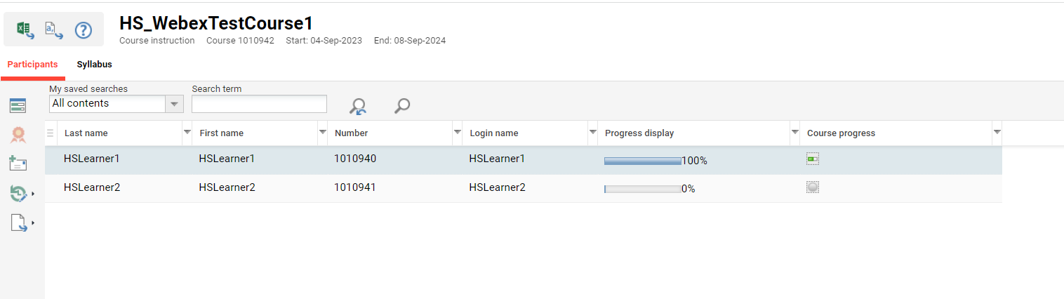 iLS provides the attendance tracking table (see screenshot) in the “course manager“ menu of the top navigation bar. It shows the learner’s course component status, which can be set by the learner status to “passed” or “failed”. According to this status the tutor or the course administrator and can change accordingly the course status. The cronjob “WebexParticipantAttendancePortfolioUpdate” needs to be set up and executed regularly or manually to retrieve the participation data from the Webex Server. The participation data can be retrieved after 10-30 min after the meeting has finished.