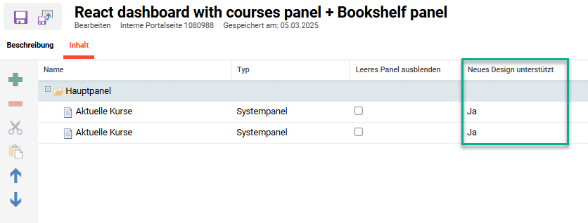 Fügen Sie im Tab Inhalt nur Panels hinzu, bei denen in der Spalte Neues Design unterstützt ein “Ja” vermerkt ist.